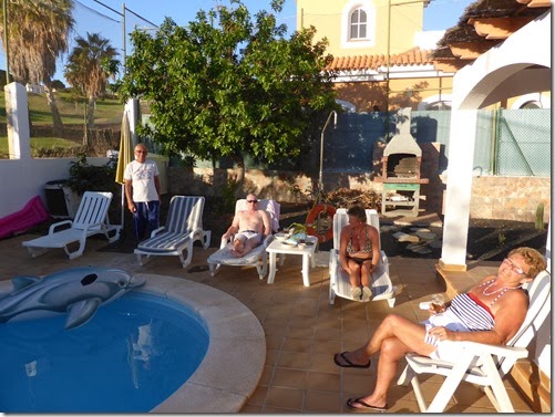 …..we walked back to our friends’ villa and continued our sunny relaxation around the pool – enjoying both their great company and the wine and nibbles! With the temperature in the high 20’s Bill, Doug, Les and Eileen take in the afternoon. sunshine.