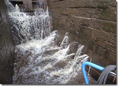 Since leaving Manchester the locks, both single and double, have provided a series of novel or awkward problems. The “broad” locks, although they are wide, they are not long. That means just one boat at a time and positioned diagonally. One of the hazards is that the bow of the boat can get caught on the footplates of the bottom gates and that’s just what happened to “Waterlily”! Pauline and Doug had to quickly lower the paddles to stop any more water leaving the lock as it could have turned the boat over.